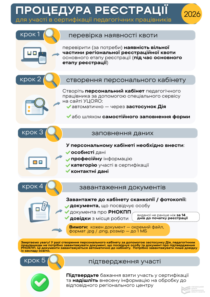 Відповідно до зазначеного наказу реєстрація педагогічних працівників для участі в сертифікації триватиме протягом 09 січня – 19 січня 2026 року й проходитиме у два етапи: