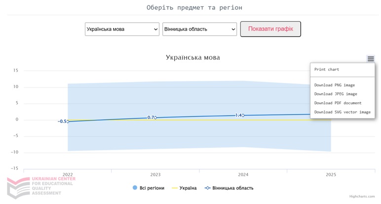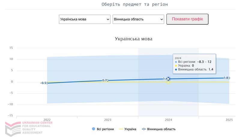 1. Обрати територію та тло, на якому буде зображено динаміку результатів. Наприклад, якщо буде обрано «Регіон в Україні», то інфографіка відображатиме показник обраного регіону (області) на тлі показників усіх регіонів України. А якщо буде обрано «Громада в регіоні», то інфографіка відображатиме показник обраної громади на тлі показників усіх громад регіону (області). Можливі такі опції: ![]() 2. Обрати предмет, регіон (область), та район чи громаду, інфографіку чиїх показників буде відображено. Натиснути кнопку «Показати графік». 3. Як читати інфографіку? Інфографіка нижче відображає показник з української мови Вінницької області (синя лінія) у порівнянні з показником з української мови України (жовта лінія) на блакитному тлі «ріки», яка містить показники з української мови усіх регіонів України від найнижчого до найвищого «берега» за роками: від 2022 до 2025 року. Числа на лінії показують на скільки відсотків середній результат з української мови учасників з Вінницької області відрізняється від середнього результату з української мови в Україні. Наприклад, у 2024 році в Україні нижній «берег ріки» з української мови становив -8,3%. Це є найнижчий показник деякого регіону. Це означає, що з української мови середній бал учасників такого регіону є на 8,3% нижчий від середнього балу учасників усієї України. Тоді ж як найвищий показник деякого іншого регіону становив 12% - верхній «берег ріки». Це означає, що з української мови середній бал учасників такого регіону є на 12% вищий від середнього балу учасників усієї України.